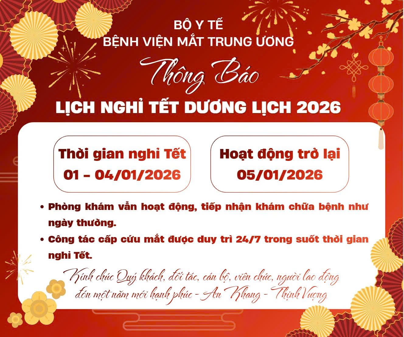 Bệnh viện Mắt Trung ương xin thông báo lịch nghỉ Tết dương lịch 2026.